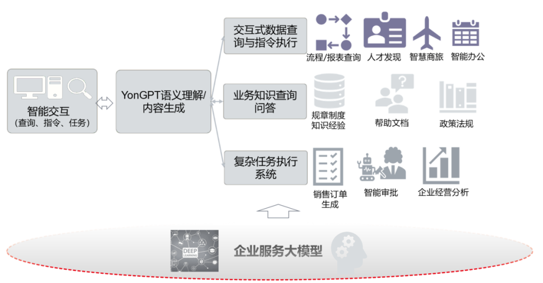 用友身為行業前列的企業數智化軟件與服務提供商,在幾年前就率先提出了“數智企業”的概念,定義了以數字和智能技術共同驅動的數智商業創新,數據驅動、智能運營的企業新范式。用友基于服務企業三十五年的經驗積累,融合了企業各個領域專業知識和各類行業商業 KnowHow,經過領域、行業數據的預訓練和精調,推出了業內首個企業服務大模型——YonGPT。YonGPT能夠理解、解析各類企業數據,應用于各類業務場景,為企業提供智能化的人機協作、業務洞察、商業決策支持和智能運營服務。